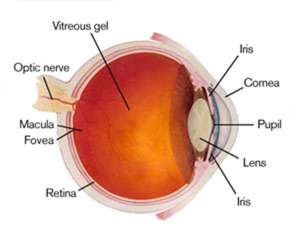 The eye consists of these major parts: the sclera, cornea, iris, lens, vitreous, retina, macula and the optic nerve.
